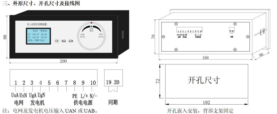 WZ-10型數(shù)字同步同期表是專為發(fā)電機(jī)并網(wǎng)而設(shè)計(jì)的一款指示裝置,它采集電網(wǎng)電壓和待并發(fā)電機(jī)電壓,測(cè)量電網(wǎng)及發(fā)電機(jī)實(shí)時(shí)電壓、頻率、相角并以數(shù)字形式顯示和模擬360度燈盤顯示出來(lái),當(dāng)待并發(fā)電機(jī)電壓差、頻率差、相角差滿足設(shè)定條件要求時(shí),裝置同期指示燈點(diǎn)亮,同時(shí)輔助輸出同期繼電器接點(diǎn)脈沖。