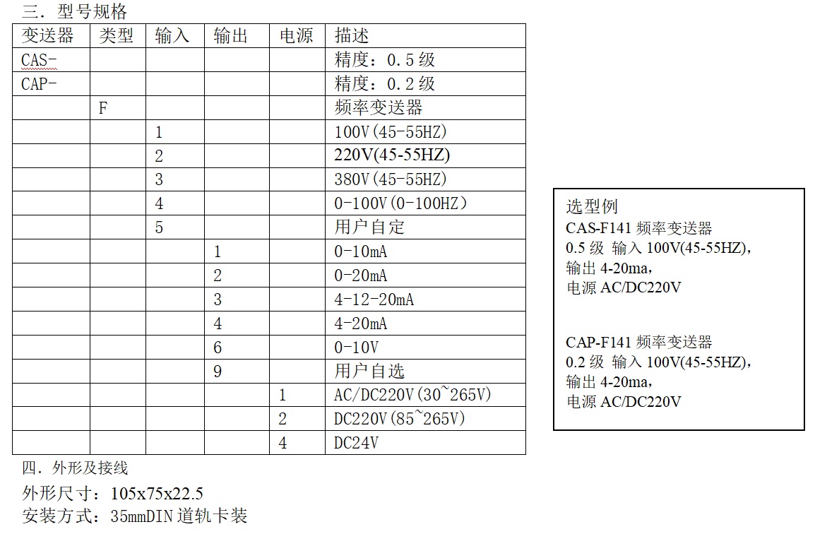 CAS系列頻率變送器是將被測電壓頻率信號轉(zhuǎn)換成按線性比例輸出直流電流、電壓并隔離的設(shè)備。